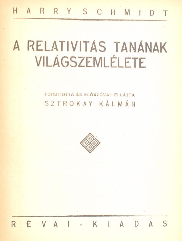 Schmidt, Harry: A relativitás tanának világszemlélete. Ford. és előszó... https://www.darabanth.com/hu/457-Gyorsarveres/457.0/Konyvek/Konyvek-Termeszettudomany-medicina~1500026/Schmidt-Harry-A-relativitas-tananak-vilagszemlelete-Ford-es-eloszoval-ellatta-Sztrokay-~II3052815
