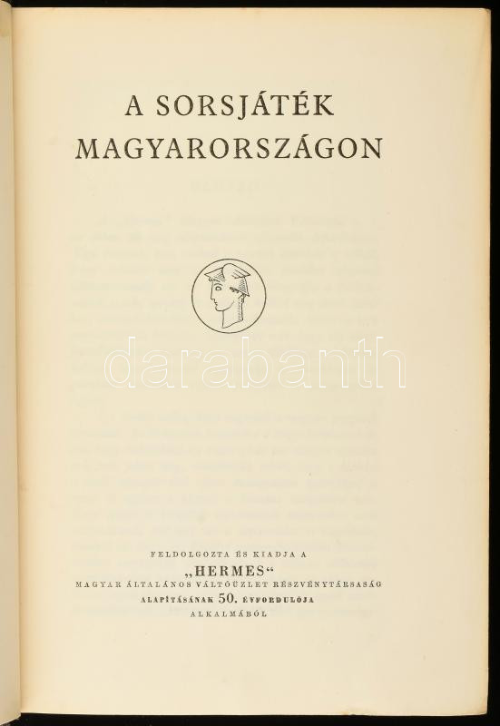 A sorsjáték Magyarországon. Feldolgozta és kiadja a ,,Hermes" Magyar Általános Váltóüzlet Részvénytársaság alapításának 50. évfordulója alkalmából. [Bp., 1943.], 503 p. + 19 t. + 6 táblázat, kihajt. Gazdag képanyaggal. Kiadói félvászon-kötésben, kopott borítóval, foltos lapokkal, egy tábla hiánnyal.