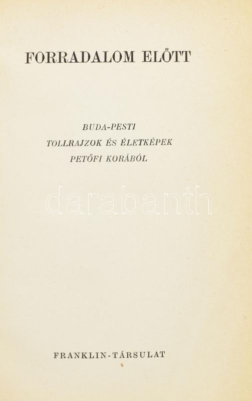 Forradalom előtt. Buda-pesti tollrajzok és életképek Petőfi korából. Szerk.: Waldapfel József. (Bp., 1948), Franklin-Társulat. 212 p. + 19 (fekete-fehér képek) t. Kiadói kartonált papírkötés, a borítón némi kopással, néhány kis folttal, egyébként jó állapotban.