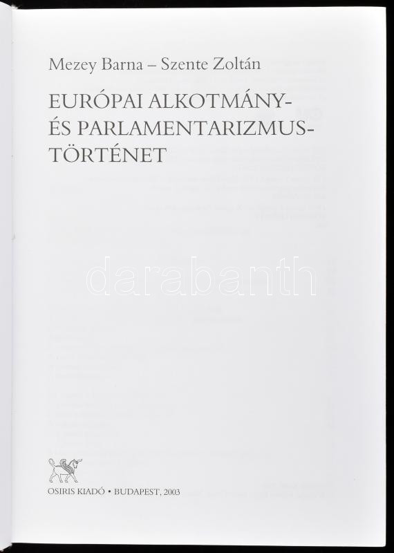 Mezey Barna-Szente Zoltán: Európai alkotmány- és parlamentarizmustörténet. Bp., 2003, Osiris. Kiadói kartonált papírkötés, kissé kopott gerinccel és borítóval, néhány lapon ceruzás jelölésekkel.
