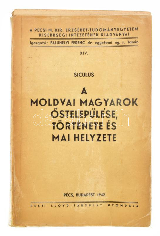 Siculus (Besenyő Sándor): A moldvai magyarok őstelepülése, története és a mai helyzete. Pécs-Budapest, 1942, Pesti Lloyd Társulat, sérült kiadói papírkötés, sérült gerinccel.