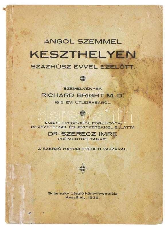 Bright, Richard: Angol szemmel Keszthelyen százhúsz évvel ezelőtt. Szemelvények - - 1815. évi útleírásából. Ford., bevezetéssel és jegyzetekkel ellátta: Dr. Szerecz Imre. Keszthely, 1935, Sulyánszky László-ny. 79+(1) p.+ 3 t. Kiadói papírkötés, a borítón erősebb (viasz?) foltokkal, helyenként foltos lapokkal.