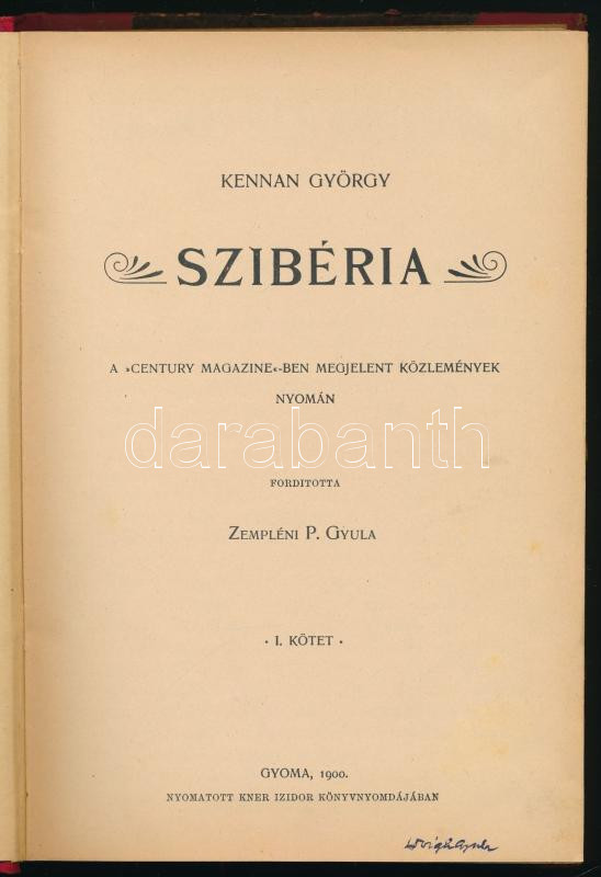 Kennan György: Szibéria. I. köt. A "Century Magazine"-ben megjelent közlemények nyomán. Ford.: Zempléni P. Gyula. Gyoma, 1900, Kner Izidor, 23+1 p. A mű 3 kötetben teljes! Átkötött félvászon-kötés, kopott borítóval.