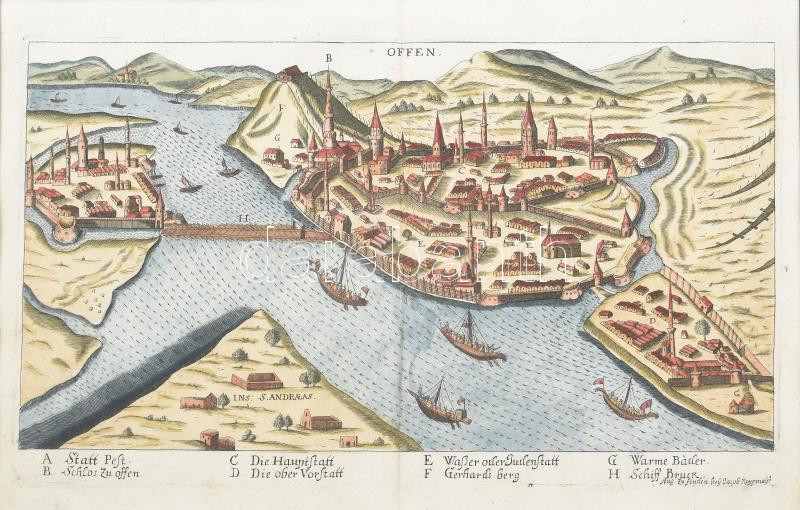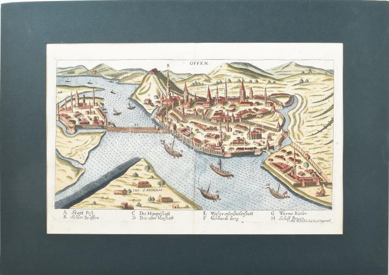 1685 Jacob Koppmayer: Buda, Pest és a Margit sziget (Szt András sziget) rézmetszetű látképe. A látkép alatt a városrészek és műtárgyak neveivel. Felhévíz, Vízi- vagy Zsidóváros, 19x31 cm paszpartuban