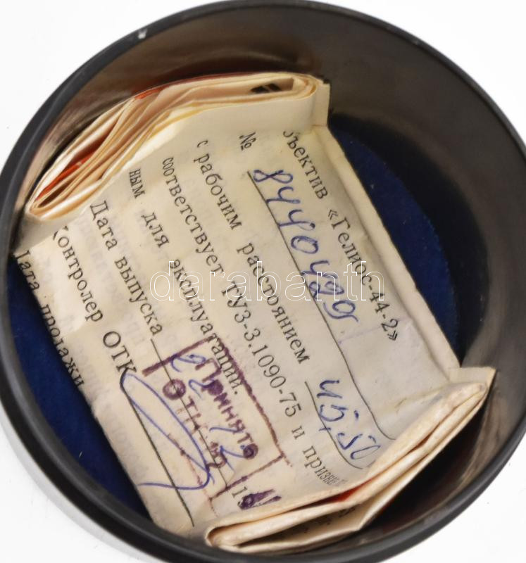 Leírás: Helios 44-2 58mm f/2 objektív, eredeti tokjában, sapkával, orosz nyelvű leírással