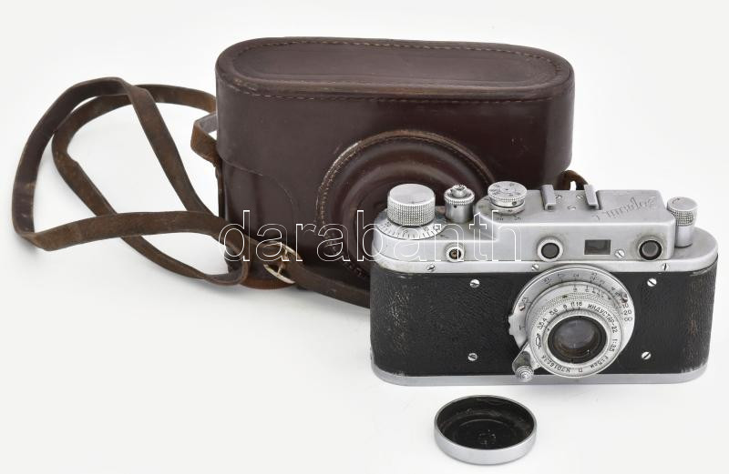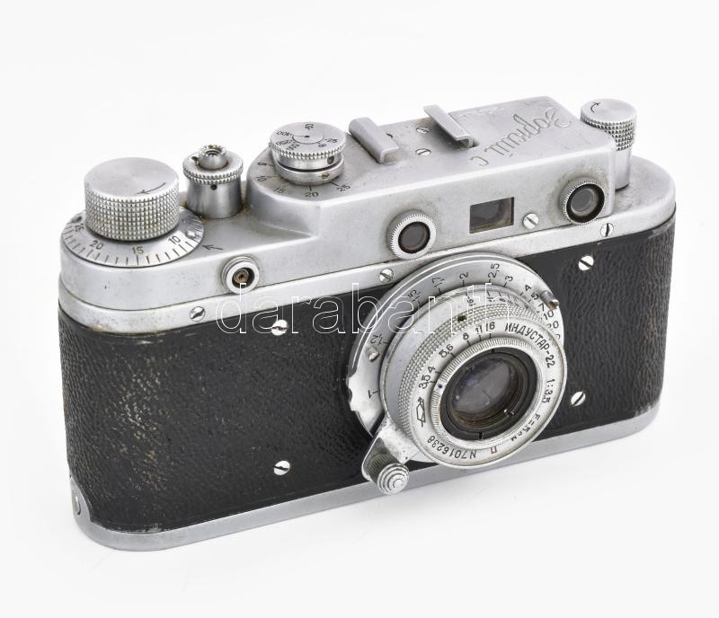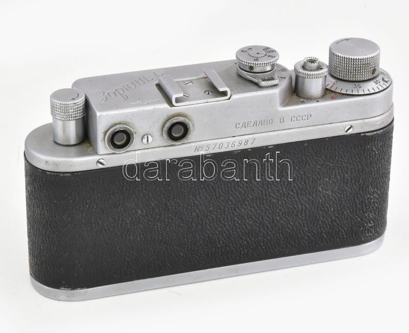cca 1955-1960 Zorkij Sz szovjet távmérős fényképezőgép, 35mm filmformátum, Industar-22 1:3,5 F=5cm objektívvel, sapkával, eredeti bőr tokjában / Zorki S Vintage USSR 35mm film rangefinder camera, in original leather case