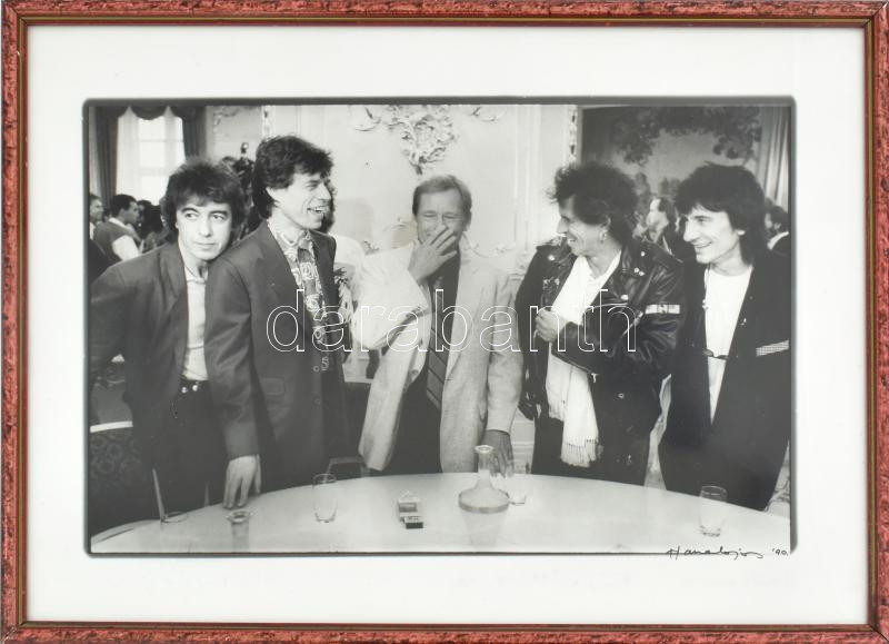 Rolling Stones tagjai (Mick Jagger, Keith Richards stb.) és Vaclav Havel, 1990. Sokszorosított fotó. Olvashatatlan jelzéssel. Üvegezett fakeretben. 24,5x35,5 cm.