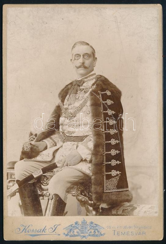 cca 1900 Lovag Vest Ede, a Temesi Agrár Takarékpénztár igazgatója, a Temesvári Kereskedelmi és Iparkamara elnöke, a Ferenc József-rend középkeresztje, a Vaskorona-rend III. osztálya (ez a képen is látható), illetve további kitüntetések tulajdonosa díszmagyarban. Kabinetfotó Kossak József temesvári műterméből, hátoldalán felületi sérülésekkel, ragasztófolttal, 16x11 cm