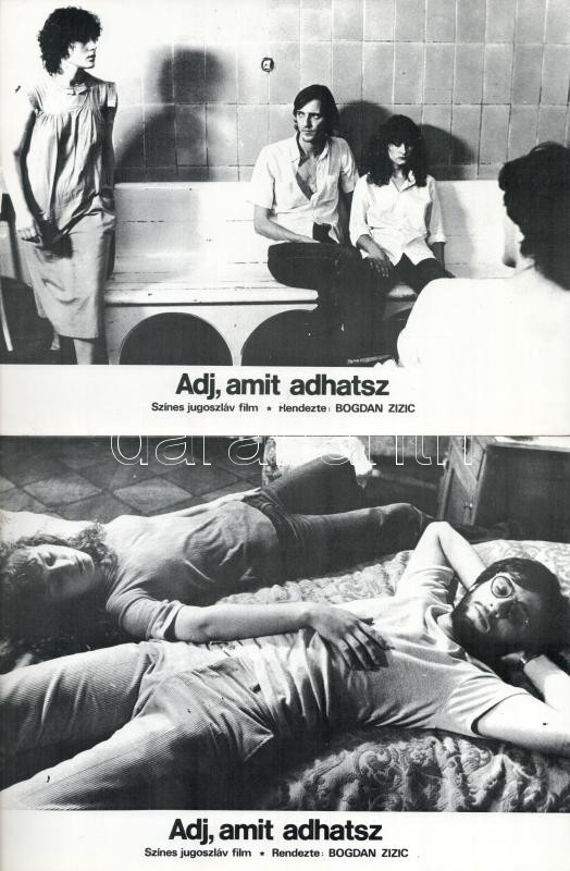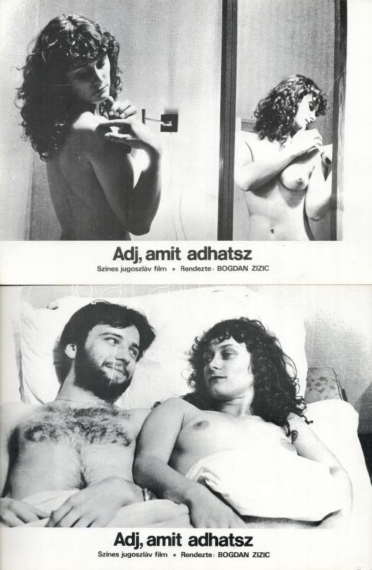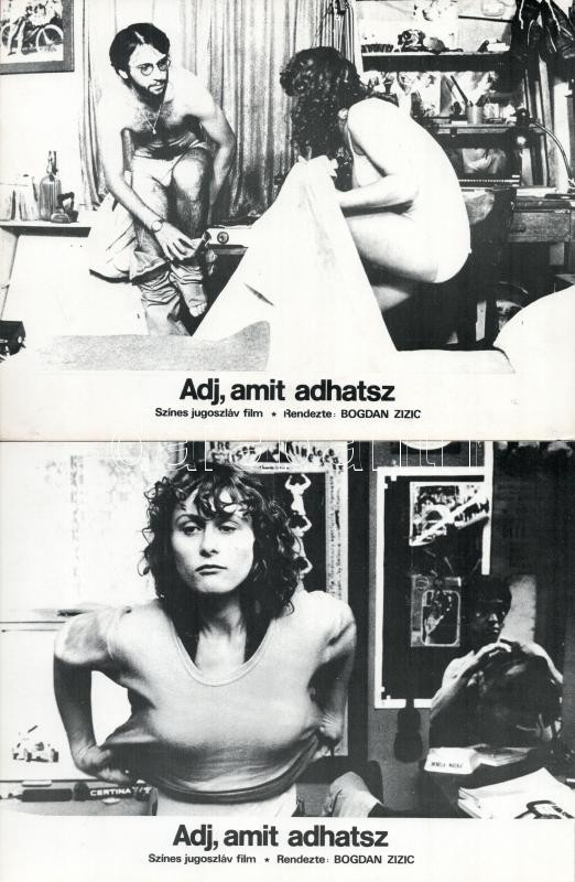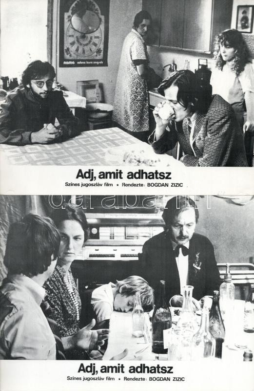 cca 1980 ,,Adj, amit adhatsz" című jugoszláv film jelenetei és szereplői, 8 db produkciós filmfotó (vitrinfotó, lobbyfotó) nyomdatechnikával sokszorosítva kartonpapírra, egyoldalas nyomással, a használatból eredő (esetleges) kisebb hibákkal, 18x24 cm