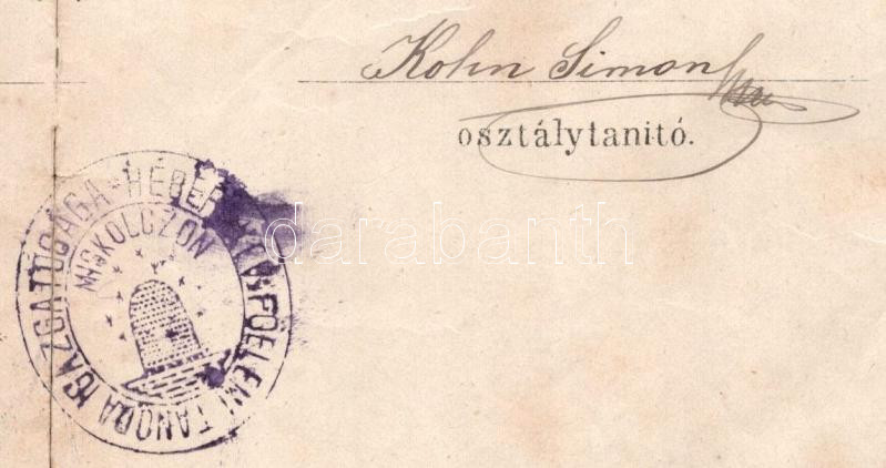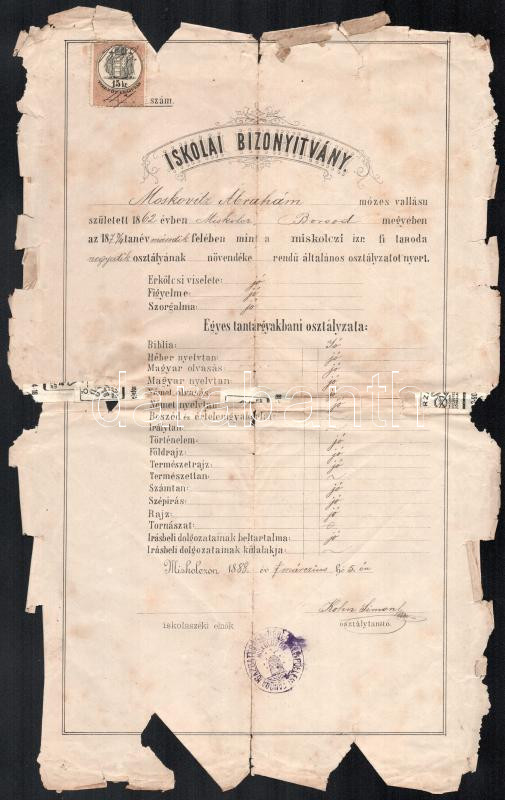 1888 Miskolc, a miskolci izraelita férfi tanoda bizonyítványa Moskovitz Ábrahám részére, Kohn Simon osztálytanító aláírásával, az iskola bélyegzőjével, megviselt állapotban
