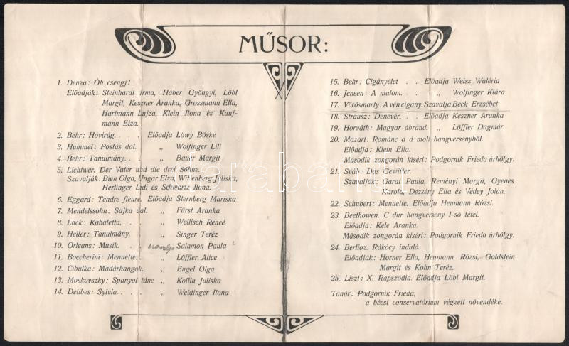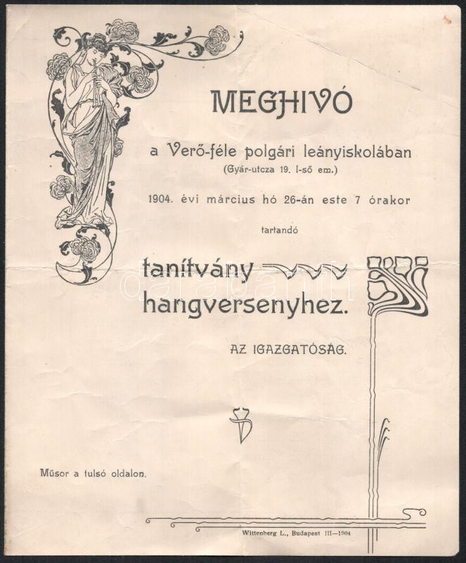 Leírás: 1904 A Verő-féle izraelita polgári leányiskola meghívója hangversenyhez szecessziós díszítésekkel, hajtott