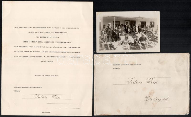 1930 Kremenezky János (Johann Kremenezky), a Magyar Wolframlámpa Gyár (az Orion gyár elődje) tulajdonosa, cionista (fontos szerepe volt a Zsidó Nemzeti Alap létrehozásában, amely az Izrael állami létét megalapozó földvásárlási mozgalmat finanszírozta) 80. születésnapi meghívója, német nyelven, eredeti borítékkal + Kremenezky Jánost ábrázoló fotólap, 14x9 cm