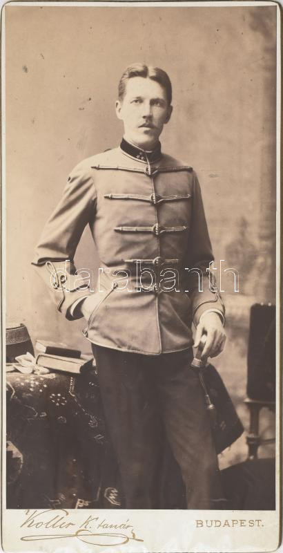 Leírás: cca 1910 Százados atillában, karddal és csákóval, keményhátú fotó Koller Károly tanár budapesti műterméből, 21x11 cm