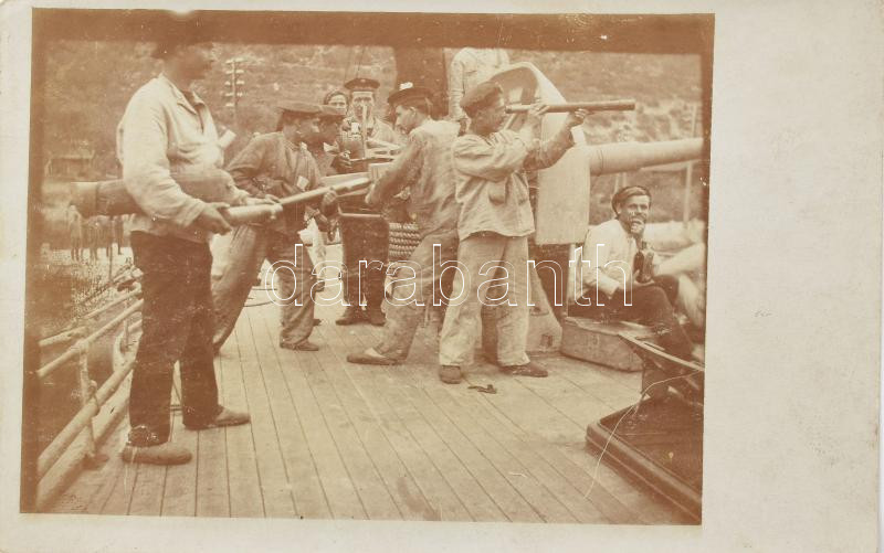 cca 1916 Az osztrák-magyar haditengerészet S.M.S. Streiter Huszár osztályú rombolóján agyúzó gyakorlatot végző matrózok fotólap / Firing practice on S.M.S. Streiter. photo postcard