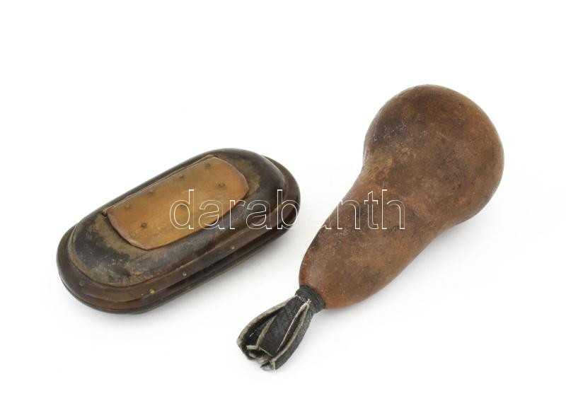 Leírás: 2 db régi tubákos szelence: szaru nyitható 9x4,5 cm + szamarkandi parafa körte formájú 10 cm