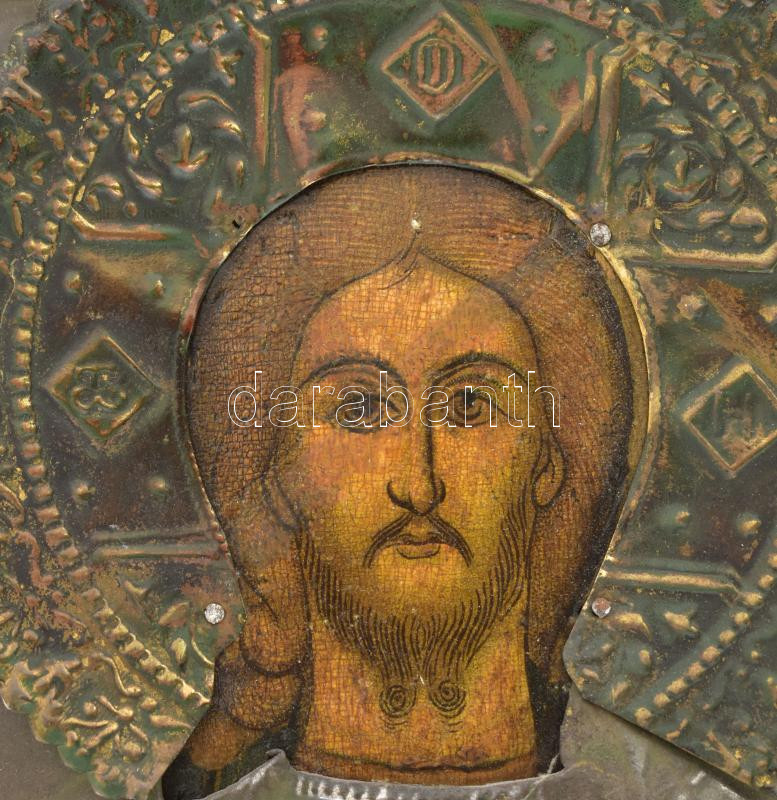 Leírás: Ikon, ezüstözött fém okláddal. XIX. sz. 24x26 cm / Icon with silver plated copper oclad. 19th century 24x26 cm