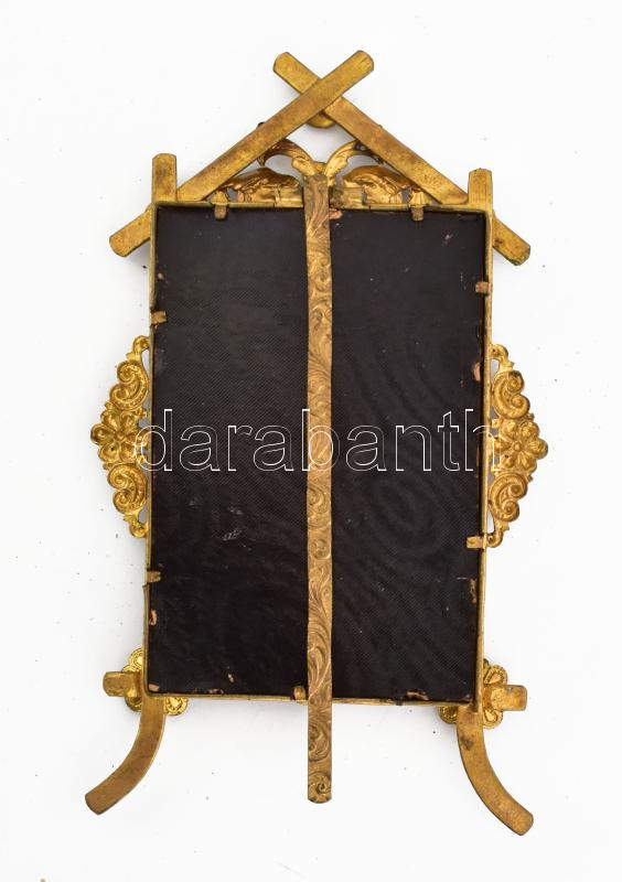 Leírás: Réz asztali fénykép keret tűzi aranyozással, kövekkel ferrotípiával 10x16 cm