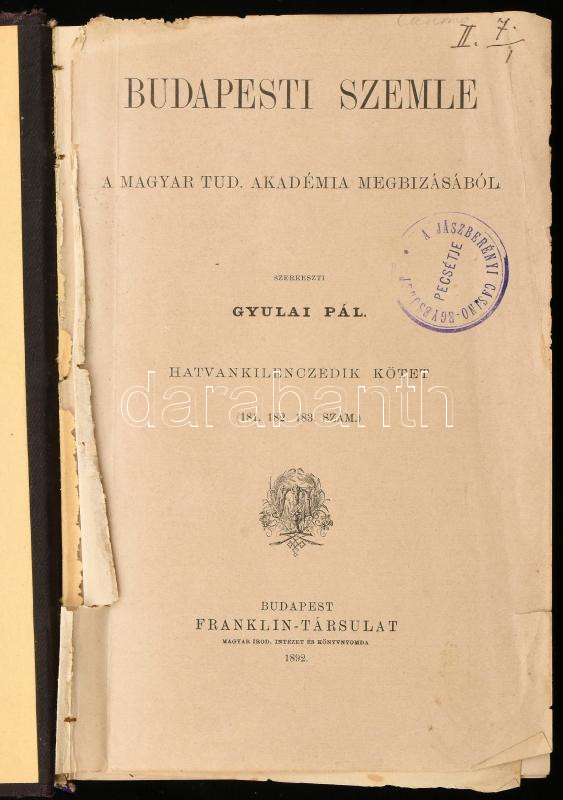 1892 Budapesti Szemle. Szerk.: Gyulai Pál. Hatvankilencedik kötet. (181., 182., 183. szám). Bp., 1892, Franklin-Társulat, 1 sztl. lev. + 480 p. Aranyozott gerincű félvászon-kötésben, márványozott lapélekkel, kissé sérült, foltos borítóval, néhány kissé foltos lappal, az első két lap kijár.