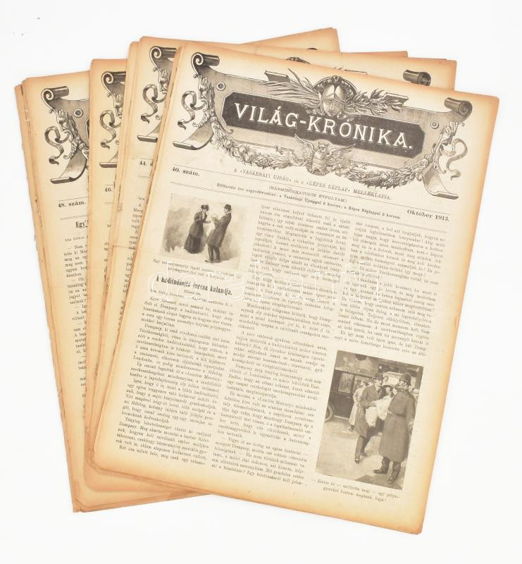 1913 Világ-Krónika, a Vasárnapi Ujság és a Képes Napilap melléklapja 40-52. számai (13 db), 1913. október-december, fekete-fehér képekkel, elbeszélésekkel (A vaskereszt, Küzdelem a férfiért, Egy bankjegy története, stb.), változó állapotban