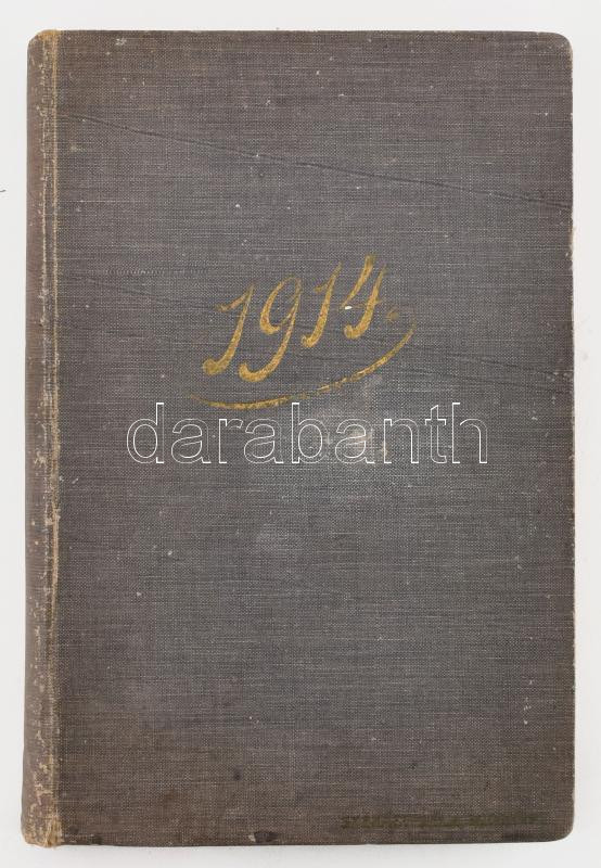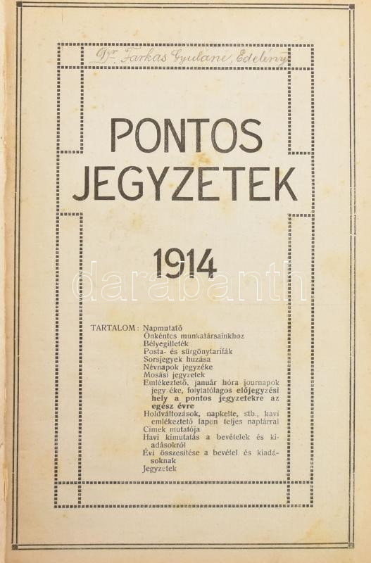 1914 "Pontos jegyzetek" határidőnapló, forgalmazó: Szénásy Béla cs. és kir. udvari szállító levélpapír áruháza, benne ceruzával írt bejegyzésekkel (háziasszony napi kiadásai, az egyik oldalon a férj tábori postacímével). Kiadói aranyozott egészvászon-kötésben, kissé foltos, kopottas borítóval, belül nagyrészt jó állapotban