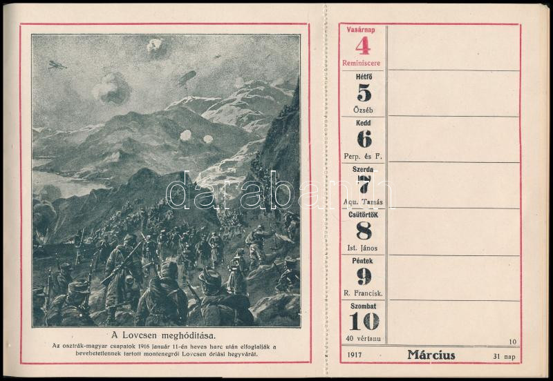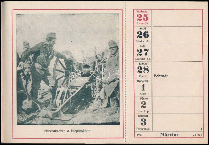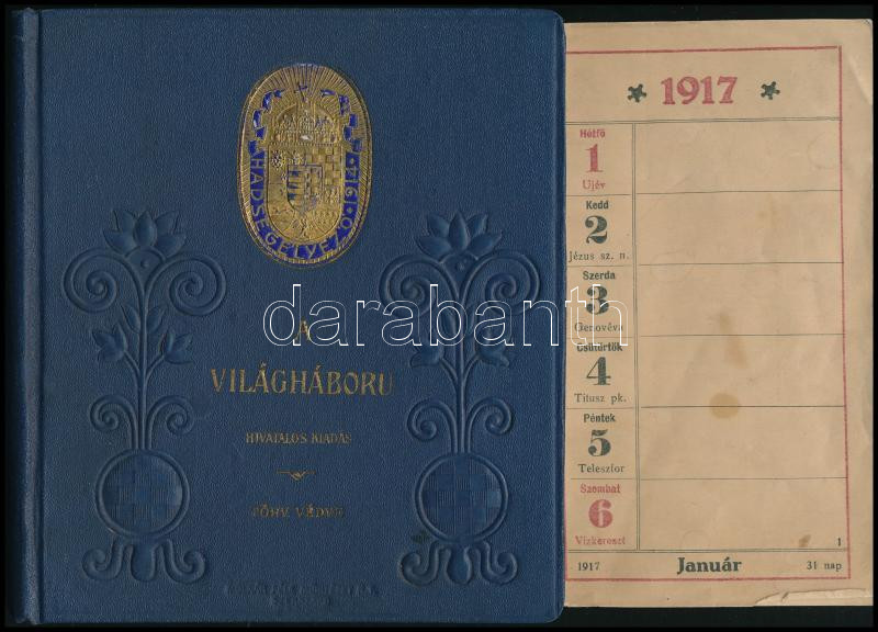 1917 A M. kir. Honv. Minisztérium hadsegélyező Hivatala által kiadott dombornyomott egészvászon kötésű naptár, sok képpel, néhol a perforációnál letépett lapokkal