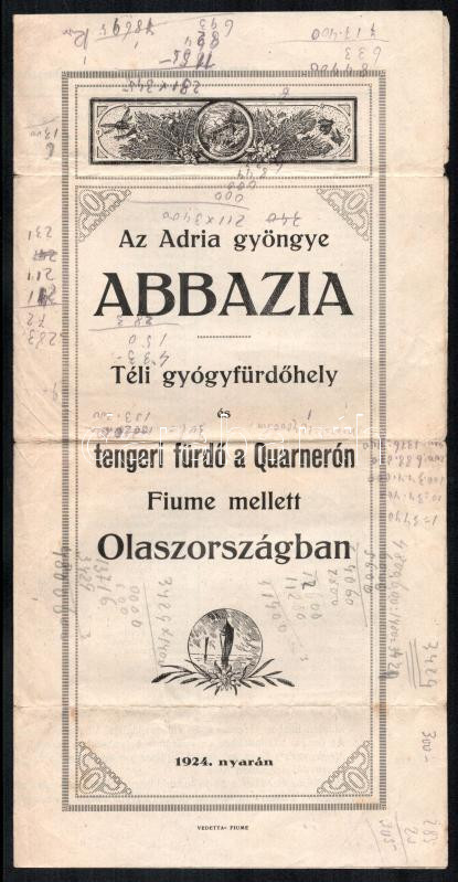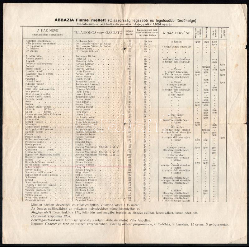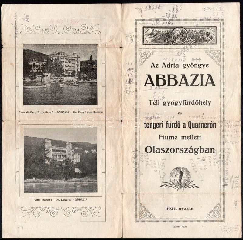 1924 Az Adria gyöngye Abbázia. Téli gyógyfürdőhely és tengeri fürdő a Quarnerón Fiume mellett Olaszországban. Sanatóriumok, szállodák és pensiók névjegyzéke 1924. nyarán. Hajtásnyomokkal, ceruzás feljegyzésekkel, kinyitva: 29x28,5 cm