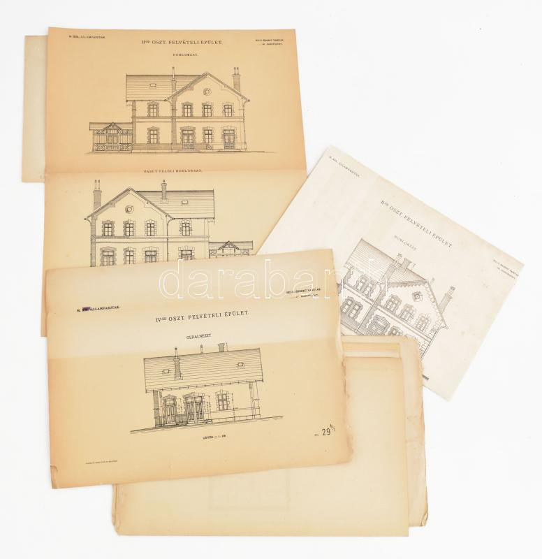 cca 1900 Magyar kir. Államvasutak szabvány tervei: különböző szintű, osztályú állomásépületek és melleéképületek tervei, összesen 14 db feliratozottklf méretben