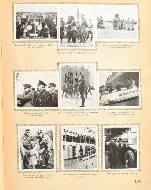 cca 1935 Hindenburg tábornok és államfő életét bemutató cigarettakép gyűjtőmappa kompletten fekete-fehér képekkel. Összesen 125 oldalon. Sérült vászonkötésben / Collecting booklet with pictures complete with damaged binding