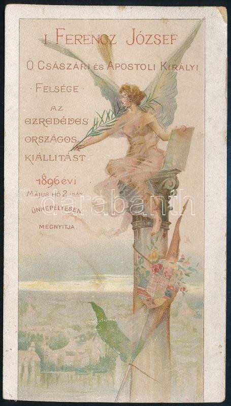 1896 Belépő az ezredéves országos kiállítás megnyitójára, Basch Árpád illusztrációjával, Kosmos Műintézet, litho, sérült, az alját levágták, 16,5x9,5 cm./ 1896 Ticket for the Millenium Expo opening ceremony, damaged, 16,5x9,5 cm