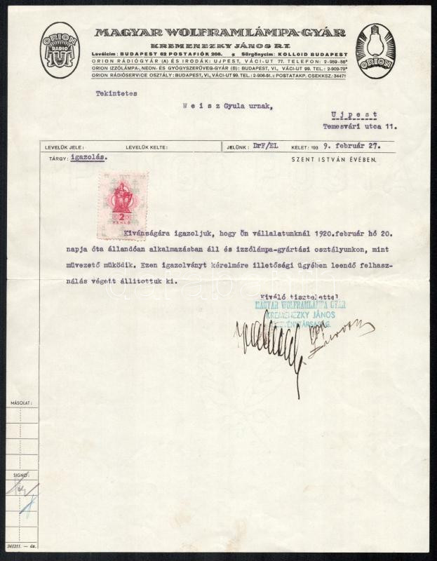Leírás: 1939 Magyar Wolframlámpa-Gyár, Kremenezky János Rt. (Orion) fejléces papírján kiállított munkáltatói igazolás Weisz Gyula részére, 2P okmányélyeggel