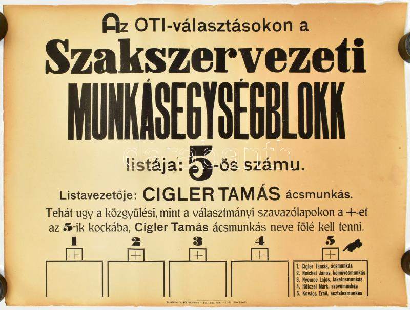 cca 1930-1940 Munkásblokk OTI választás plakát, beszakadásokkal, 47×63... https://www.darabanth.com/hu/457-Gyorsarveres/457.0/Mutargy-papirregiseg-egyeb/Plakat~1500016/cca-1930-1940-Munkasblokk-OTI-valasztas-plakat-beszakadasokkal-47C39763-cm~II2999390