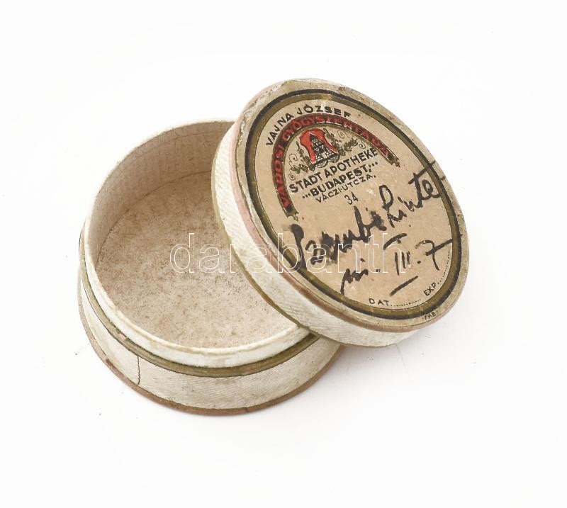 Leírás: cca 1900 Vajna József Városi Gyógyszertára Bp. Váci utca hintőporos doboza, jó állapotban, d: 4,5 cm