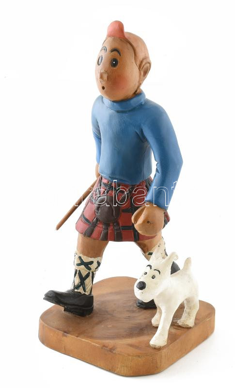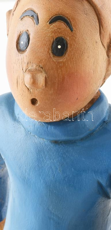 cca 1970 Francia pop-art szobor: Tintin és Milou. Faragott és festett fa, minimális kopottsággal. Jelzés nélküli, de a 70-es évek francia pop-art irányzatának egy jegyzett sorozatából való. M: 47 cm "A pop-art 20. századi képzÅ‘művészeti irányzat. Angliában született az 1950-es években. Az 1960-as évek elejétÅ‘l kezdve Amerikából terjedt el, de részben a dadaizmusban és a szürrealizmusban gyökerezik. A szó a popular rövidÃtésébÅ‘l keletkezett, ami népszerűt jelent. A pop-art anyagai a popkultúra termékeibÅ‘l merÃt. Ezek az anyagok, amelyek a mindennapi életben is nagy szerepet játszanak: az utca, a lakás tárgyai, plakátok, képregények, zászlók, hirdetések, jelszavak stb. A pop-art technikája széles: valóságos tárgyakat vesz át változtatás nélkül, újra előállÃtja a pontos másukat."