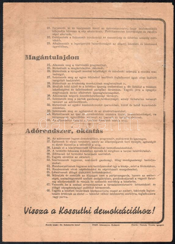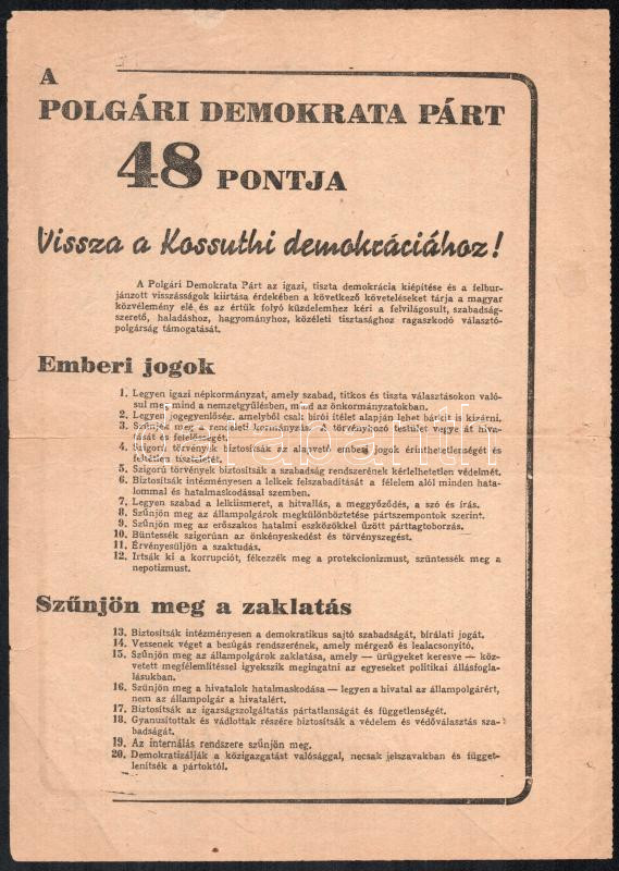 Leírás: 1947 "A Polgári Demokrata Párt 48 pontja. Vissza a Kossuthi demokráciához", Bp., Athenaeum-ny., kékcédulás választások, hajtott, kis szakadással.