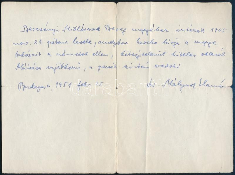 Leírás: 1951 Mályusz Elemér (1898-1989) történész, akadémikus véleményezése Bercsényi Miklós által kiállított okirat eredetiségéről, egy kézzel írt oldal, Mályusz Elemér autográf aláírásával