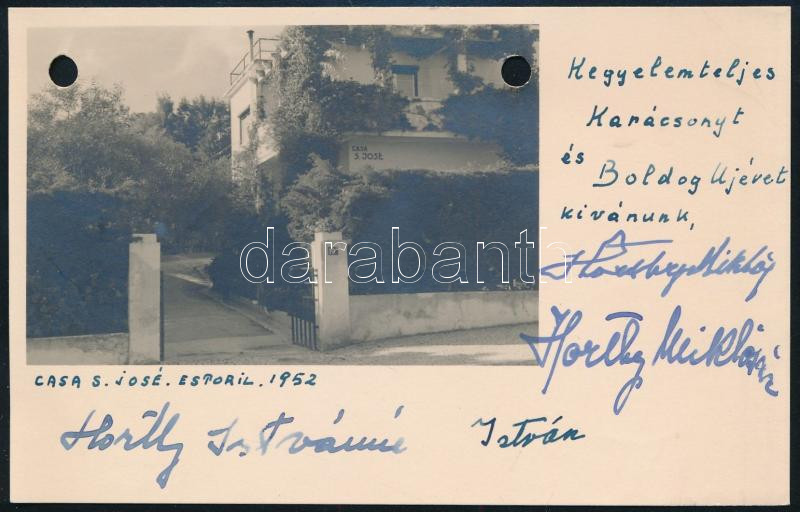 1952 Horthy Miklós (1867-1957), Horthy Miklósné jószáshelyi Purgly Magdolna (1881-1959) és Horthy Istvánné Edelsheim-Gyulai Ilona (1918-2013) és Ifj. nagybányai Horthy István (1941-) aláírásai egy karácsonyi üdvözlő lapon, amely az estorili házukat ábrázolja, a felületén két lyukkal, 9x14 cm
