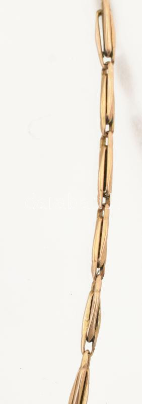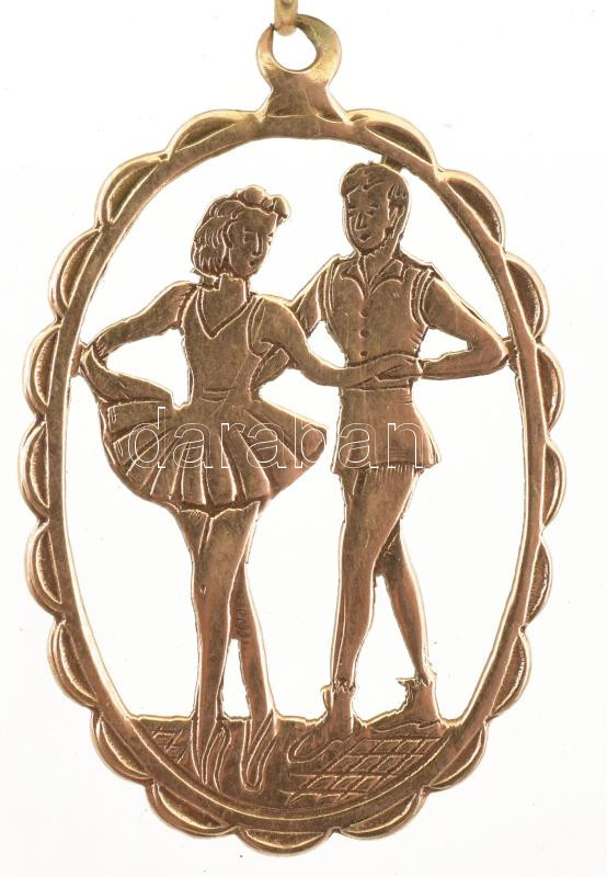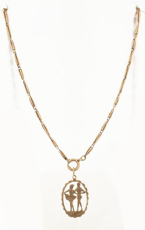 Leírás: 14K arany (Au) nyaklánc, fiatal táncos párt ábrázoló medállal, jelzett, szakadással, h: 50 cm, 14,07 g