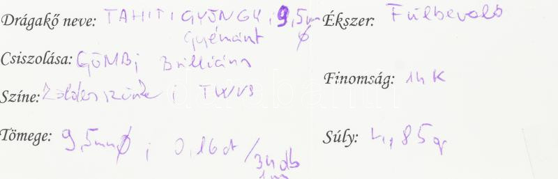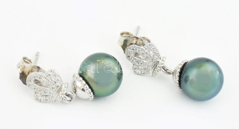Leírás: Arany (Au) 14K fülbevalópár 34 db gyémánttal és Tahiti gyönggyel, jelzett, h: 2,5 cm, bruttó: 4,85 g