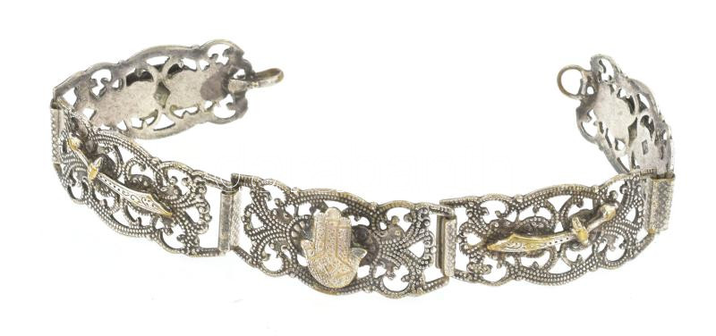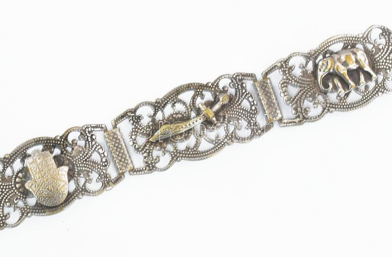 Leírás: Ezüst (Ag) keleti karkötő, Fatima keze, szablya és elefánt motívumokkal. Jelzett, kis kopással, 15,6 g, h: 18 cm