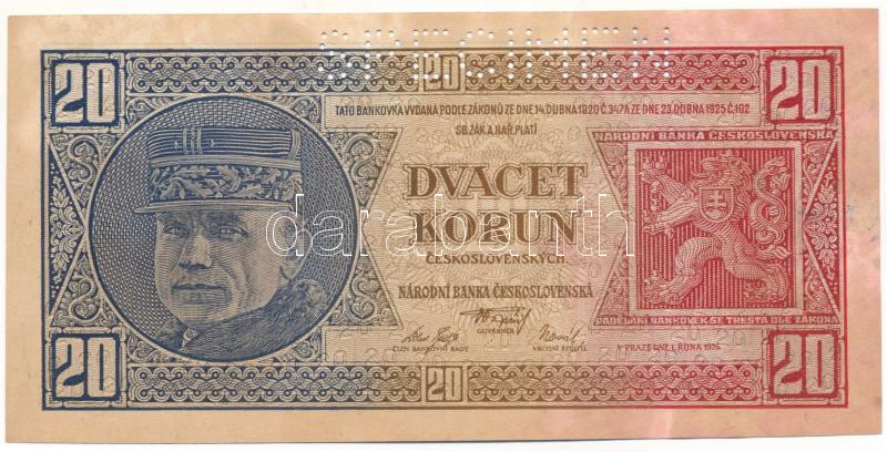 Csehszlovákia 1926. 20K "Ig 223533" "SPECIMEN" per... https://www.darabanth.com/hu/457-Gyorsarveres/457.0/Numizmatika/Kulfoldi-bankjegyek~15/Csehszlovakia-1926-20K-Ig-223533-SPECIMEN-perforacioval-TAU-elszinezodott-papir-Czecho~II3001351