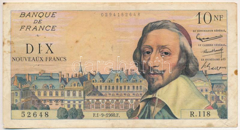 Leírás: Franciaország 1960. 10Fr T:F fo., tűlyukak, kis anyaghiány France 1960. 10 Francs C:F spotted, pin holes, small missing material Krause P#142