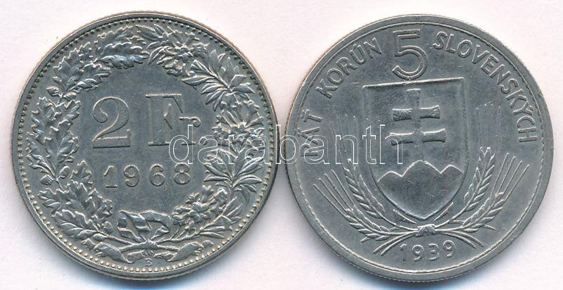 Leírás: Szlovákia 1939. 5K Ni "Andrej Hlinka" + Svájc 1968. 2Fr Cu-Ni T:AU,XF karc