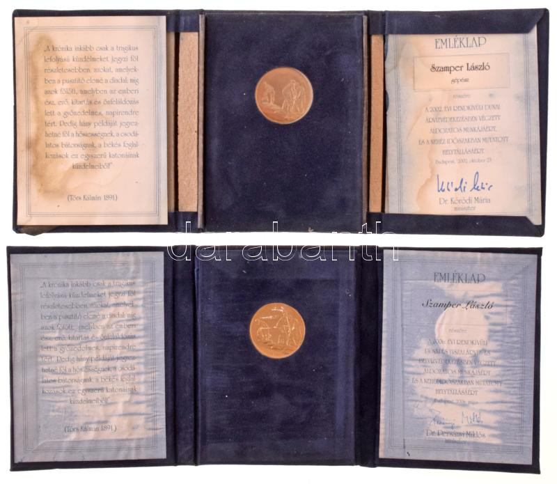 2002-2006. "Az Árvíz- és Belvízvédekezésért - Vízügy" fém emlékérem bársony borítású, de elázott dísztokban, adományozói okirattal, Dr. Kóródi Mária és Dr. Persányi Miklós aláírásával (2xklf, 29mm) T:UNC