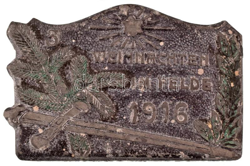 Osztrák-Magyar Monarchia 1916. "3. karácsony a fronton" festett Zn kitűző hátoldalán "K.U.K. KRIEGSFÜRSORGEAMT" felirattal és "WINTER & ADLER A G WIEN" gyártói jelzéssel (25x38mm) T:VF kopott festés Austro-Hungarian Monarchy 1916. "3. WEIHNACHTEN IM FELDE (3rd Christmas on the Battlefield)" painted Zn badge with "K.U.K. KRIEGSFÜRSORGEAMT" inscription and "WINTER & ADLER A G WIEN" makers mark on the back (25x38mm) C:VF worn painting
