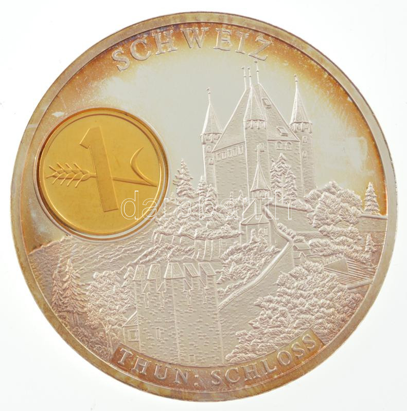 Leírás: DN "Európai pénznemek / Svájc - Thun kastély" ezüstözött fém emlékérem, benne 1984. 1r aranyozva, kapszulában (50mm) T:PP patina