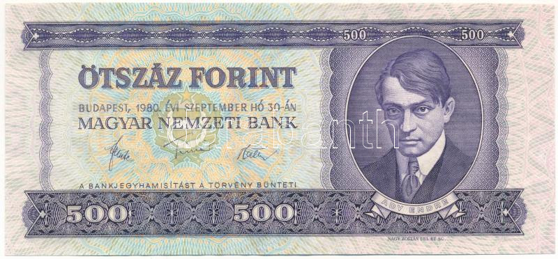 Hungary 1980. 500 Forint "E 423 081100" C:AU hard wavy paper, printing ink spots