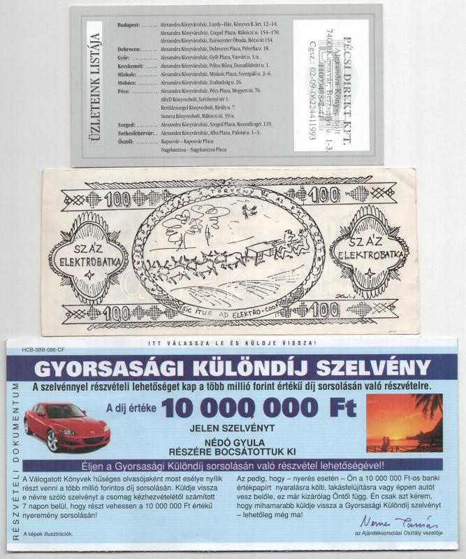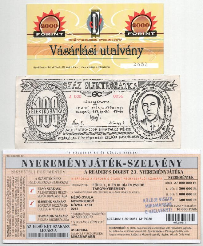 Leírás: 3db klf modern utalvány, nyereményjáték-szelvény, közte 1987. 100 Elektrobatka "Ipari Minisztérium" T:AU-VF