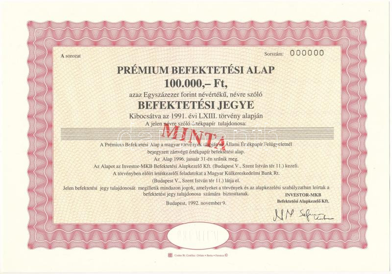 Leírás: 1992. "Prémium Befektetési Alap" befektetési jegye, piros "MINTA" felülbélyegzéssel, 000-ás sorszámmal T:AU
