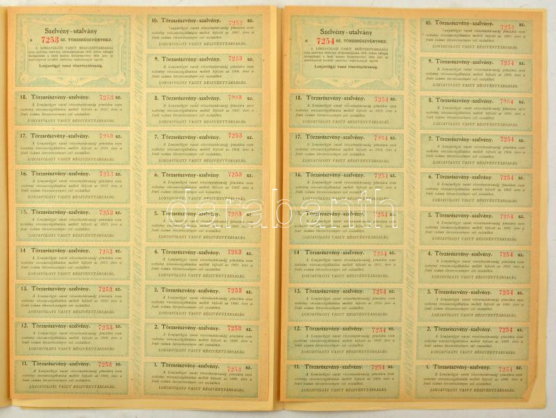Budapest 1896. "Lonjavölgyi Vasut Részvény-Társaság" törzsrészvénye 200Ft-ról (2x) sorszámkövetők "7353-7354", teljes szelvényutalványokkal, szárazpecséttel T:AU / Hungary / Budapest 1896. "Railway Share Company of the Lonja Valley" common stock about 200 Forint (2x) sequential serials "7353-7354", with whole coupon voucher, with embossed stamp C:AU