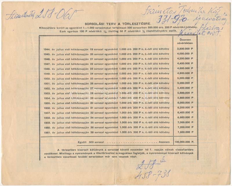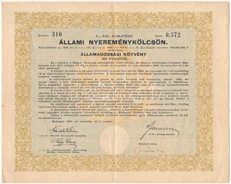 Leírás: Budapest 1941. "4%-kal kamatozó állami nyereménykölcsön - államadóssági kötvény" 200P-ről szárazpecséttel, szelvényekkel T:F kis oldalsó szakadás, hátoldalán tollas írás